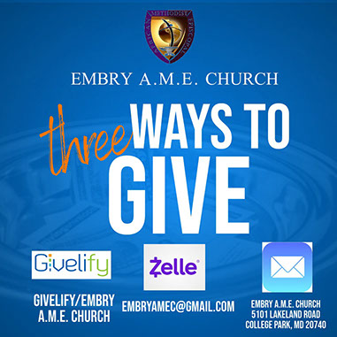 Gifts and donations can be made through Givelify at GIVELIFY/EMBRY A.M.E. CHURCH and Zelle at EMBRYAMEC@GMAIL.COM.